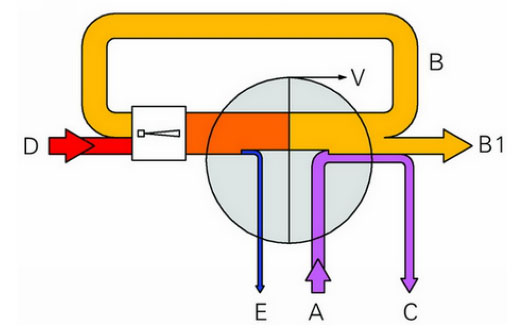 熱力蒸汽再壓縮時,根據熱泵原理,來自沸騰室的蒸汽被壓縮到加熱室的較高壓力;即能量被加到蒸汽上。由于與加熱室壓力相對應的飽和蒸汽溫度更高,使得蒸汽能夠再用于加熱。為此采用蒸汽噴射壓縮器。它們是根據噴射泵原理來操作,沒有活動件,設計簡單而有效,并能確保最高的工作可靠性。使用一臺熱力蒸汽壓縮器與增加一效蒸發器具有相同的節省蒸汽/節能效果。熱力蒸汽壓縮器的操作需要一定數量的新蒸汽,即所謂的動力蒸汽。這些動力蒸汽必須被傳送到下一效,或者被送至冷凝器作為殘余蒸汽。包含在殘余蒸汽中的剩余能量大約與動力蒸汽所提供的能量相當。