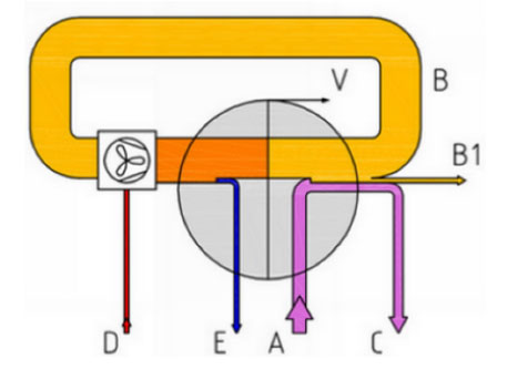 機械蒸汽再壓縮時,通過機械驅動的壓縮機將蒸發器蒸出的蒸汽壓縮至較高壓力。因此再壓縮機也作為熱泵來工作,給蒸汽增加能量。與用循環工藝流體(即封閉系統,制冷循環)的壓縮熱泵相反,因為蒸汽再壓縮機是作為開放系統來工作,故可將其視為特殊的壓縮熱泵。在蒸汽壓縮和隨后的加熱蒸汽冷凝之后,冷凝液離開循環。加熱蒸汽(熱的一側)與二次蒸汽(冷的一側)被蒸發器的換熱表面分隔開來。開放式壓縮熱泵與封閉式壓縮熱泵的對比表明:在開放系統中的蒸發器表面基本上取代了封閉系統中工藝流體膨脹閥的功能。通過使用相對少的能量,即在壓縮熱泵情況下的壓縮機葉輪的機械能,能量被加入工藝加熱介質中并進入連續循環。在此情況下,不需要一次蒸汽作為加熱介質。